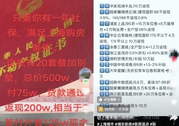 同时,对于引发广泛关注的“上海某楼盘买房返现200万元”,记者也查到了某博主的广告称:“总价500万,首付75万,返现200万”,发布时间是去年年底,而后记者联系到这位博主,其表示:“这个项目是浦东玖里书香,目前已经没有房源了。”