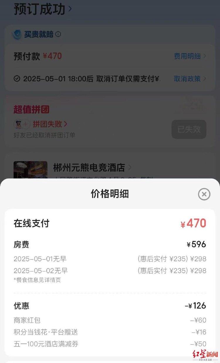 根据张先生提供的订单截图显示,其预定的上述酒店房间单日价格为235元,5月1日和2日入住两晚,两间房两日累计房费为940元。在预付房费后,订单截图明确提示“预订成功”。
