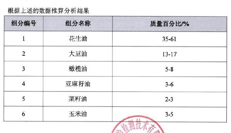 据晋先生介绍,今年4月初,他在网上联系内蒙古的批发商李老板,花6万元左右购买了270件花生油,每件4桶5升装,准备做公益免费送给困难人群,并拍摄短视频做自媒体账号。送前试吃时,他发现不是纯正花生油的味,放在冰箱里也不像纯正花生油那样凝固。于是他花2000多元将样品送到北京有资质的机构检测,4月25日检测结果出来,花生油只占35%-61%,其他掺杂了玉米油、大豆油、橄榄油、亚麻籽油等。