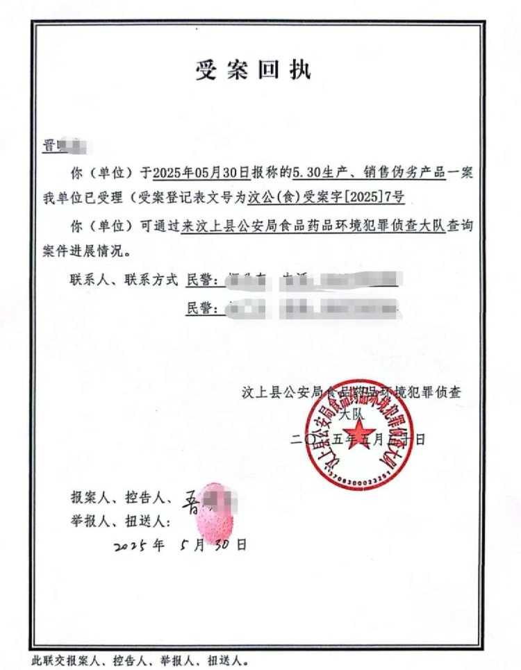 “目前我已向当地公安部门报案。”据晋先生提供的受案回执显示,5月30日,汶上县公安局食品药品环境犯罪侦查大队已受理他举报的生产销售伪劣产品案。