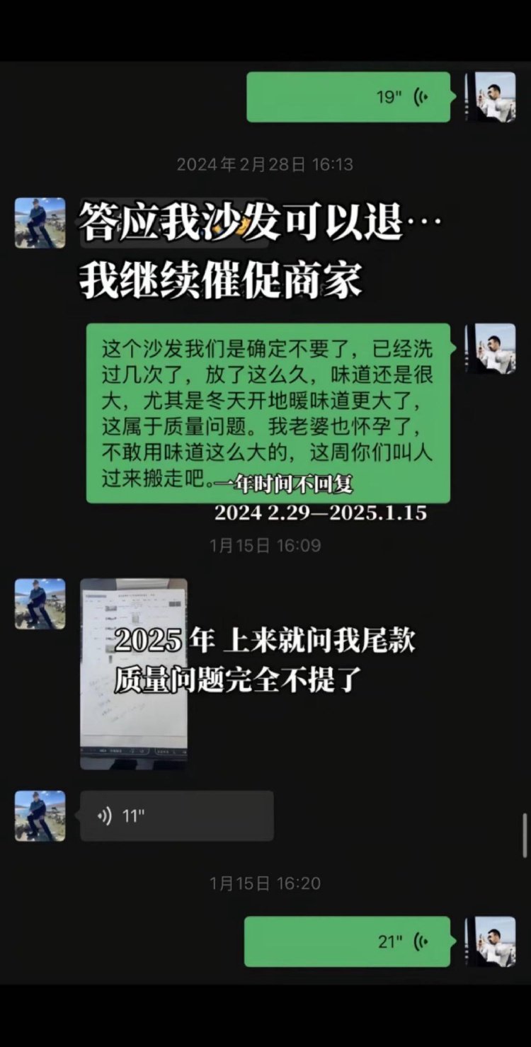 蔡先生提供的聊天记录中,他在2023年8月30日收到沙发当天,持续向对方反映沙发臭味问题,要求将沙发拖走。关于漏水问题、墙面坑洼开裂问题、窗帘问题,也反复与对方交涉。对方反复承诺会解决沙发问题,漏水和墙面问题则是其他工组造成。