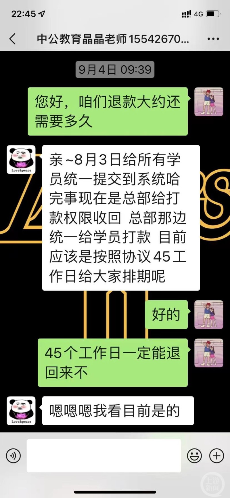 “7月29日,中公教育回复称,8月2日会将退费学员信息统一提交,随后由总部打款,最迟45个工作日到账。”小李向上游新闻记者提供了与中公教育工作人员的沟通截图。小李多次催促后,10月13日时,中公教育再次对其承诺,将在11月退款。
