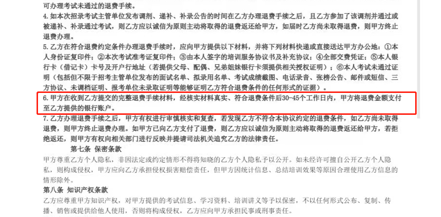 ▲学员提供的双方协议显示,退费应在30至45个工作日全额到账(即一次性到账)。图片来源/受访者供图