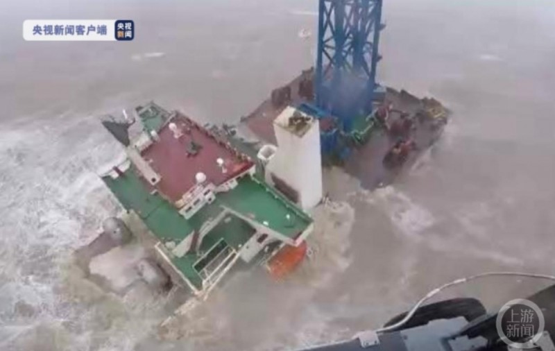 ▲7月2日,已倾斜进水的施工浮吊船福景001号轮。图片来源/ 央视新闻