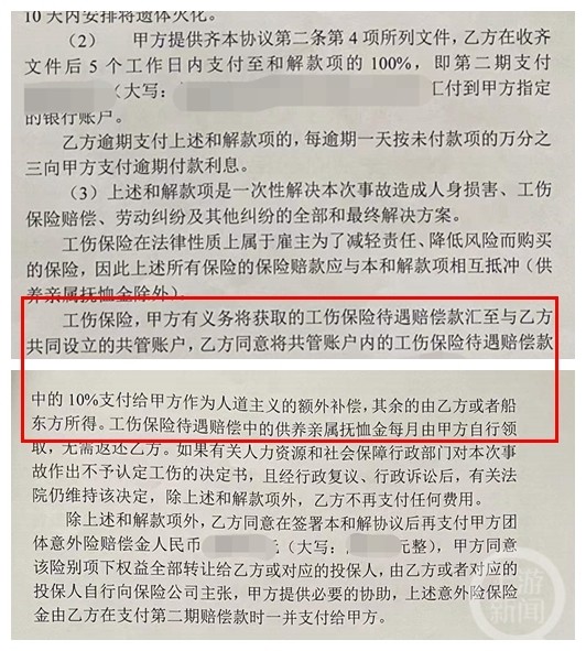 “我的协议上没有写10%工伤保险赔偿款。”遇难者家属阿园(化名)对赔偿也有异议,她的丈夫是船上的厨师,由于公司未给其买社保,和解协议上没有涉及工伤保险赔偿的细节。