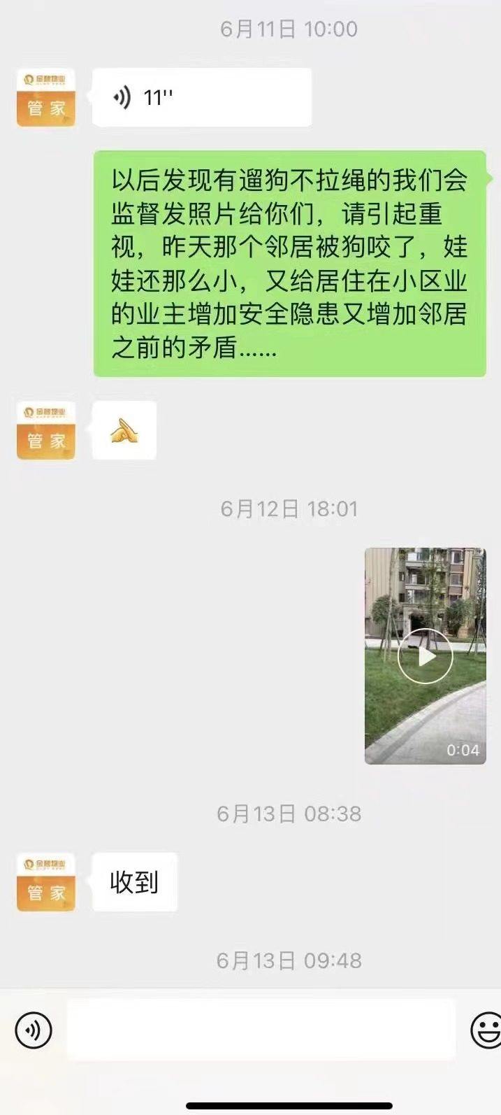 刘女士提供的与物管微信对话内容显示,今年4月5日,她向物业管家反映“三只狗不牵绳,到处跑,物业也不关门”,物管回复称“将加强宣传,也需要大家自觉相互配合。”6月11日,她又向物管发送信息称:“以后发现遛狗不牵绳的会监督发照片,请引起重视。昨天邻居被狗咬了,娃娃还那么小。这会给小区业主增加安全隐患又增加矛盾。”而在物业回复收到后第二天,刘女士又发现小区内出现没有牵绳的小狗。