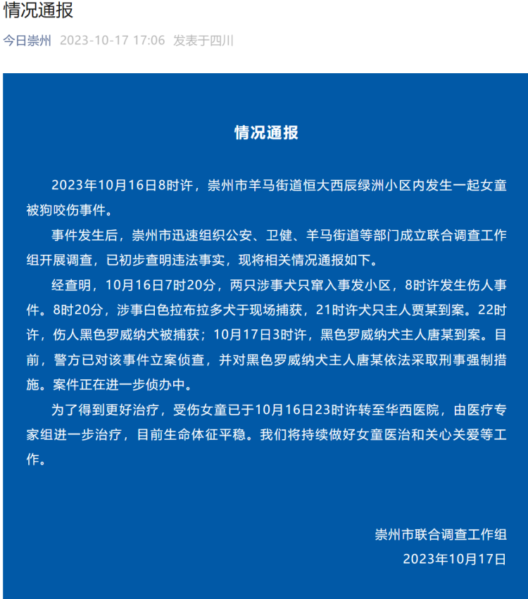 据官方通报,经查明,10月16日7时20分,两只涉事犬只窜入事发小区,8时许发生伤人事件。8时20分,涉事白色拉布拉多犬于现场捕获,21时许犬只主人贾某到案。22时许,伤人黑色罗威纳犬被捕获。10月17日3时许,黑色罗威纳犬主人唐某到案。