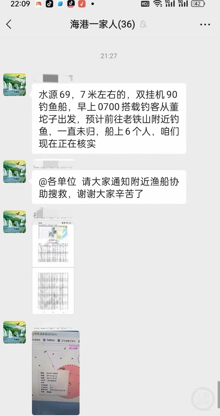 网传截图显示,在名为“海港一家人”的微信群中,一则协助搜救的消息称,“水源69,7米左右的,双挂机90钓鱼船,早上7:00搭载钓客从董坨子出发,预计前往老铁山附近钓鱼,一直未归,船上6个人,咱们现在正在核实”“请大家通知附近渔船协助搜救”。发布者还发布了数张图片,其中一张图片显示船名为SHUIYUAN69,与发文内容(水源)一致。