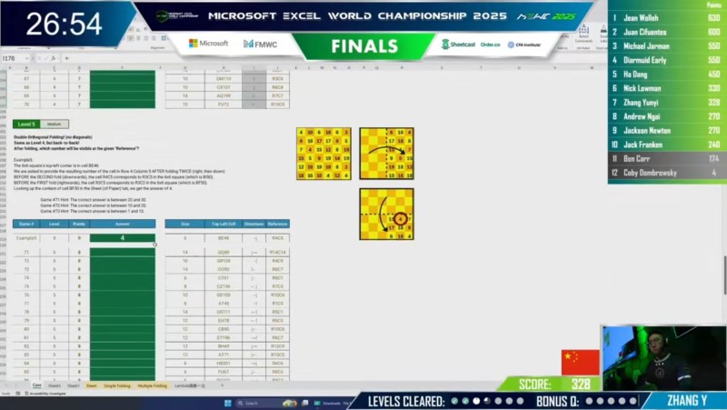 Excel世界锦标赛显然不是比谁设计的表格更漂亮,张云翼告诉记者:“比赛本身没有报名要求,任何人到官网交了报名费都可以参赛,但是这项赛事要求的不仅仅是‘熟练掌握Excel操作’,而是需要掌握XLOOKUP、XMATCH、INDIRECT、OFFSET等基础函数,VBA编程、Power Query数据处理等进阶技能,能熟练运用Excel全功能模块解决复杂问题。每次赛题是30分钟(决赛40分钟)内根据提供的数据,回答7个级别的难度递增的问题。每个问题有20个数据点,用你的公式算对一个点得相应分值。”