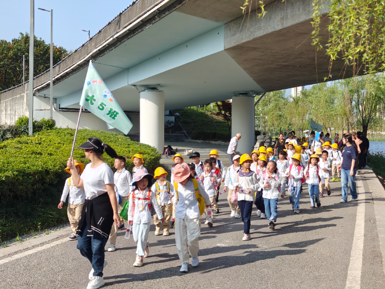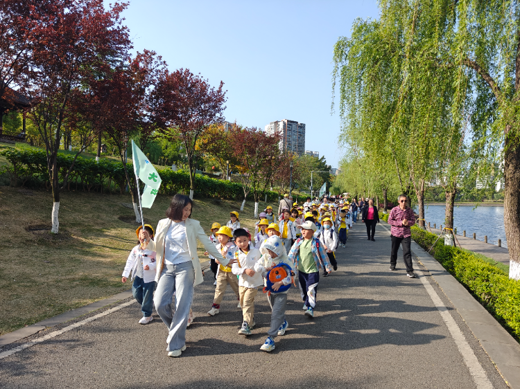 大班段的孩子最先面临的是一场考验。他们以班级为单位,沿着湖滨步道一直走到开州区博物馆。路途中,孩子们沐浴着春光,哼着歌、跳着舞,丝毫不觉疲惫。