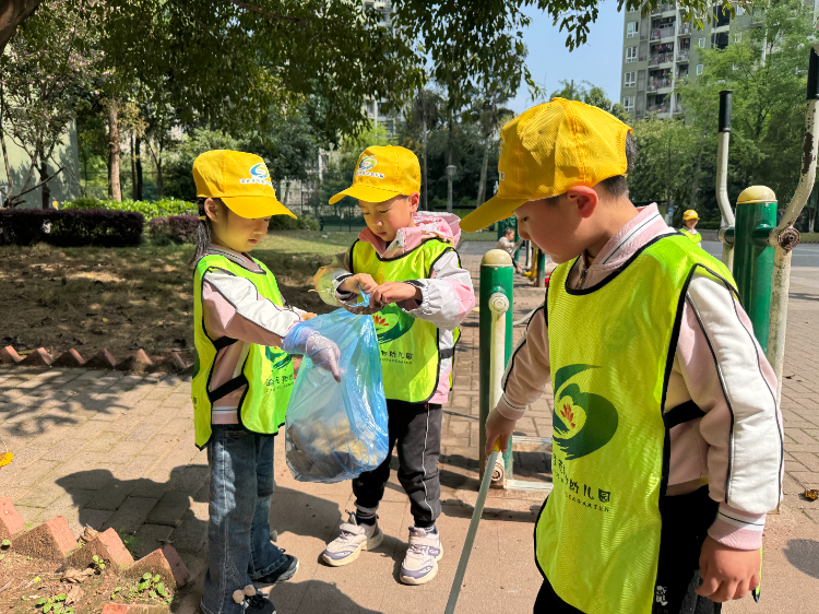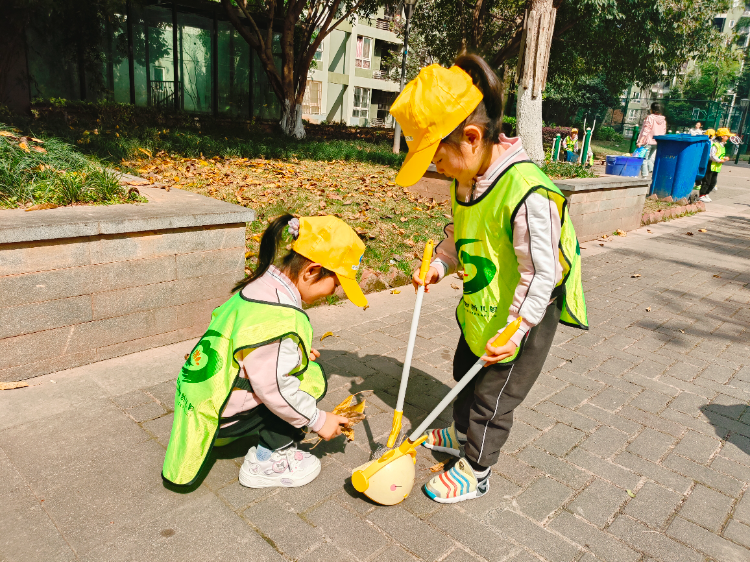 在体验环节中,孩子们手持清洁工具,认真清扫路面上的落叶、纸屑等垃圾。孩子们争先恐后蹲下身子,在草丛、地面等区域寻找烟头、纸屑、果皮、枯树叶的踪迹。