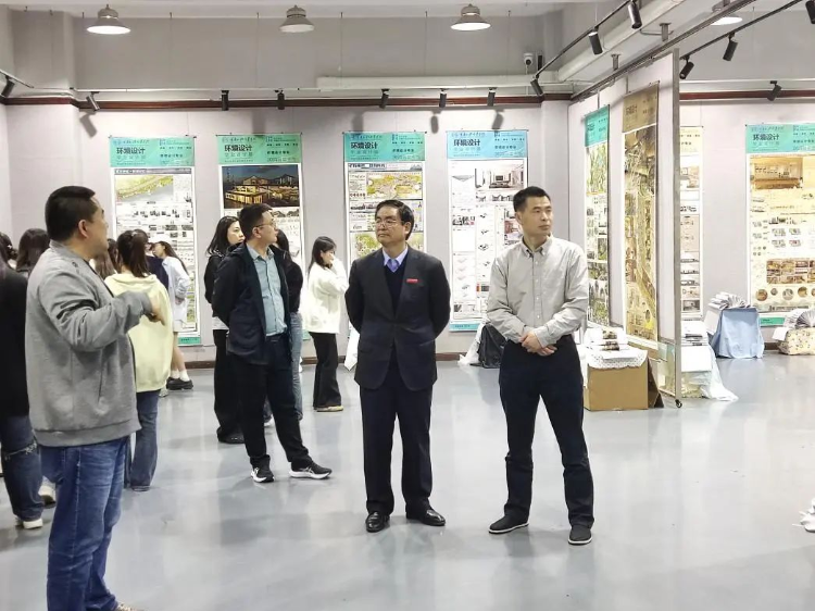 开幕式结束后,与会领导和师生共同参观了首场展览——环境设计专业专场。本次展览共展出84位同学的设计作品,涵盖商业空间、景观规划、室内设计等多个方向。王刚向领导、嘉宾们介绍了环境设计专业的教学特色,他强调本届毕业设计坚持“真题真做”,突出实践性与行业接轨。校领导认真观摩了每一件作品,并与参展学生深入交流,对部分作品给予细致点评。
