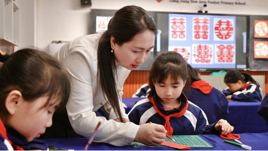 重庆两江新区云慧小学以及云启幼儿园以非遗课程为纽带,通过水拓画、扎染、剪纸等技艺,将文化自信具象化,让传统从抽象符号变为生活美学。作为剪纸艺术特色校,重庆两江新区云慧小学注重学科融合,将非遗与语文、美术、历史等相结合,深化学生对中华优秀传统文化的多维理解。