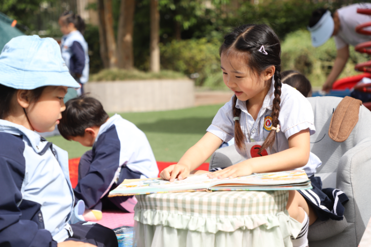 开幕式后,大带小伴读活动在操场上展开。大班的孩子带着小班的弟弟妹妹,拿上喜欢的绘本一起畅游。这一创新举措,正是大渡口跳磴幼教集团在践行全民阅读战略中的积极探索,在幼儿心中悄然种下阅读的种子。