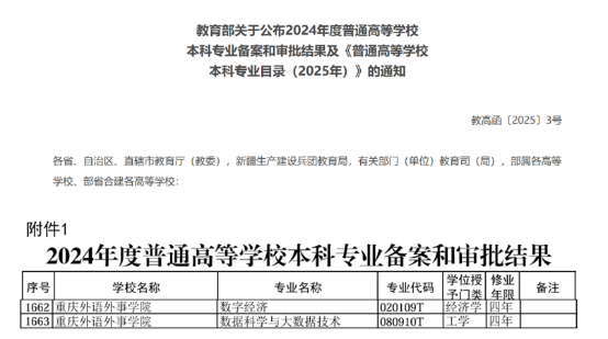 近日,教育部公布了2024年度普通高等学校本科专业备案和审批结果。重庆外语外事学院申报的“数字经济”和“数据科学与大数据技术”2个本科专业,获批教育部新增专业备案。截至目前,该校本科专业数量增至43个。