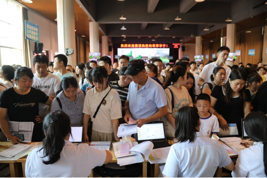 报到现场,同学们正在办理入学手续。