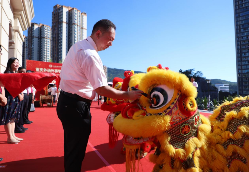 随后,学校理事长万哨凯为狮头点睛。狮头点睛寓意“唤醒灵韵,祈福纳祥”,为新大门赋予祥瑞活力,也寄托了学校对未来发展的美好期许。随后,与会领导共同为东大门剪彩,标志着綦江校区东大门正式启用。