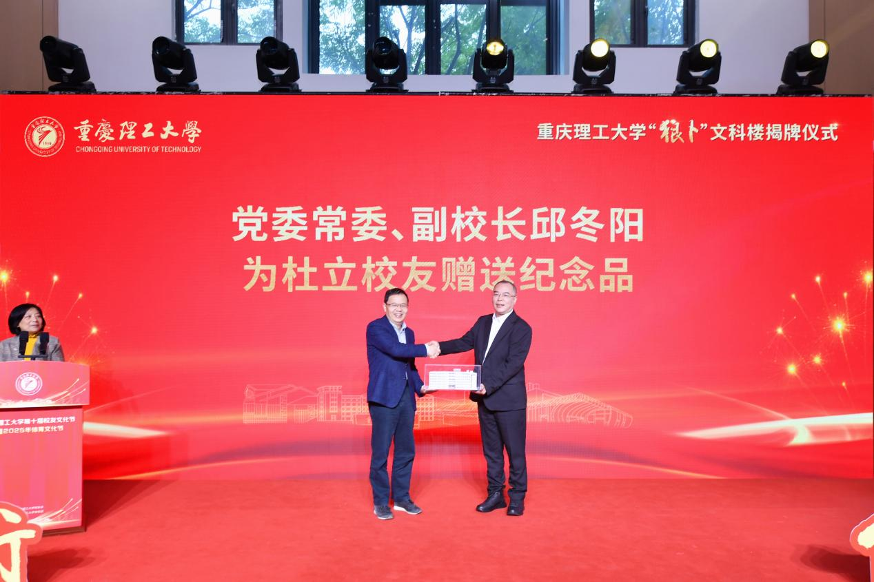 仪式上,重庆理工大学党委常委、副校长邱冬阳为杜立赠送“狼卜”文科楼实景微缩模型。与会领导与杜立共同为“狼卜”文科楼揭牌。