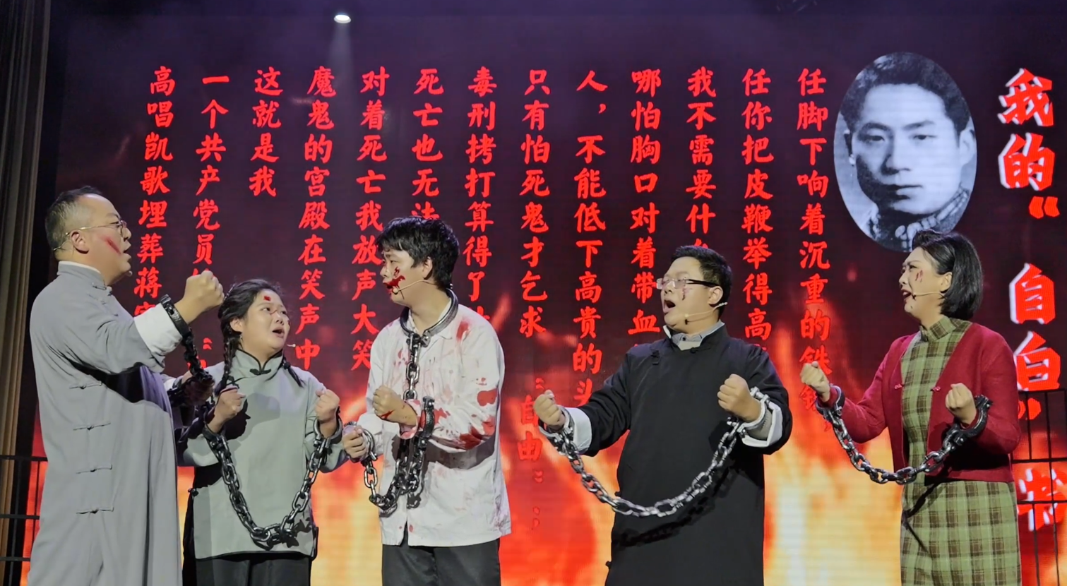 在结构上,剧作采用四幕式线性叙事——“士继青春”“火焰之光”“挺进!挺进!”“等待黎明”,清晰勾勒出余祖胜从校园觉醒、投身工运、秘密斗争到狱中坚贞、慷慨就义的生命轨迹与革命历程,节奏张弛有度,情感层层递进,最终在“等待天亮”的悲壮与期盼中达到高潮,结构完整,富有戏剧张力。