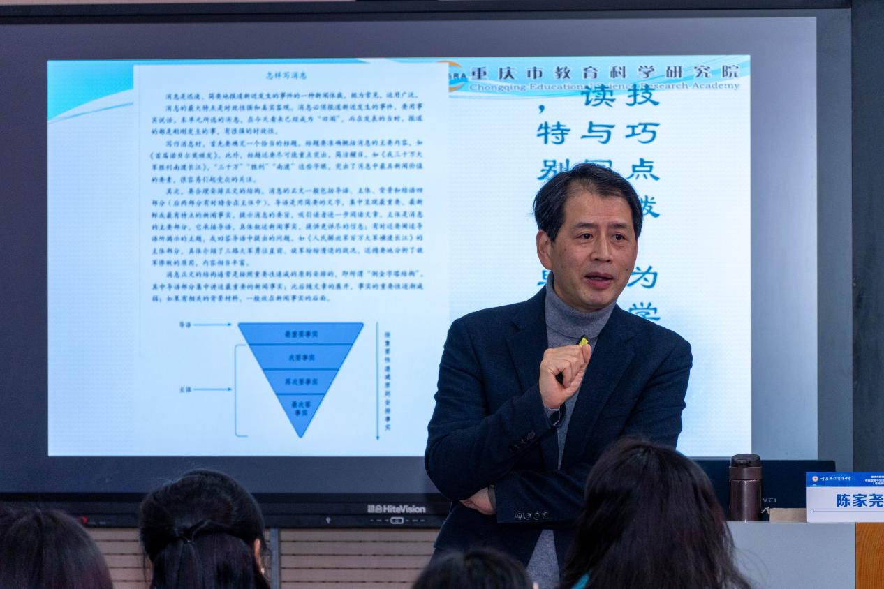 研修期间,西南大学物理科学与技术学院创新创业发展中心主任谭兴文,重庆市教育科学研究院基础教育教学研究所文科中心主任、中学语文教研员陈家尧作为特邀专家开展专题讲座,以前沿理念为引领、实操案例为支撑,为参训教师破解教学困惑、革新教学思维提供关键指引。
