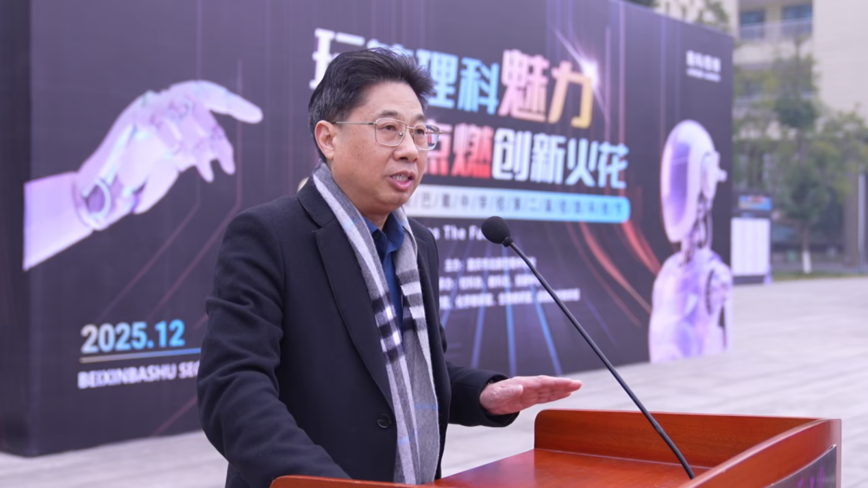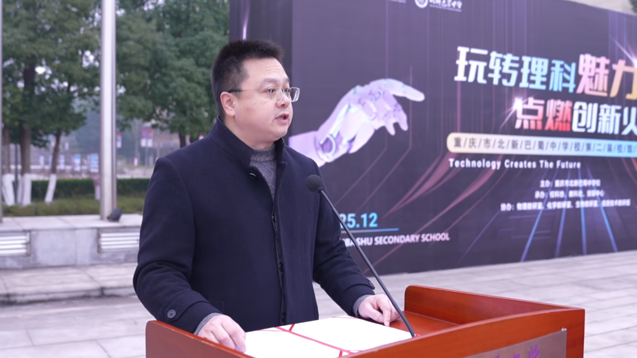 重庆市合川区科学技术协会党组书记、主席钟秀金高度肯定了北新巴蜀中学在科技创新教育领域的丰硕成果,称赞学校校园建设、课程设置与设施配备均处于一流水平。钟秀金表示,校园科技活动是培育科学精神的重要土壤,希望北新巴蜀中学能打造具有自身特色的科技教育品牌,发挥示范引领作用,加强与教共体成员校的联动协作,让科技之花在校园广泛绽放。他鼓励同学们主动学科技、用科技,在实践中收获成长与进步。