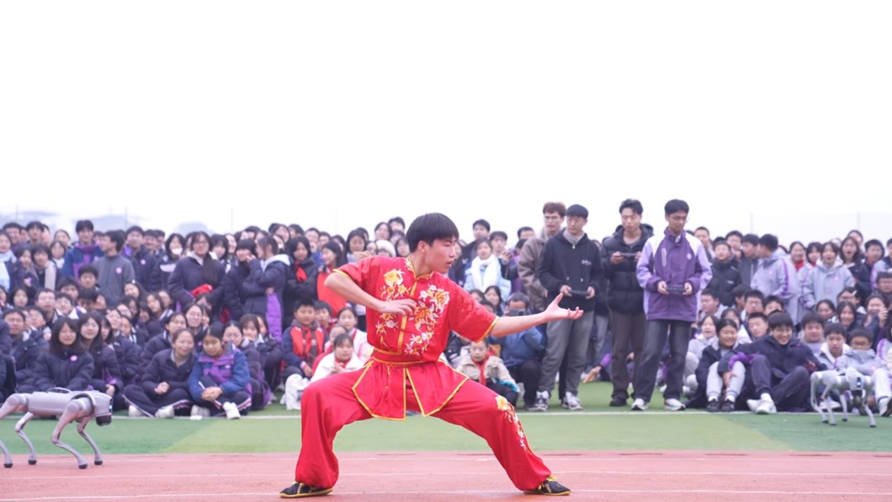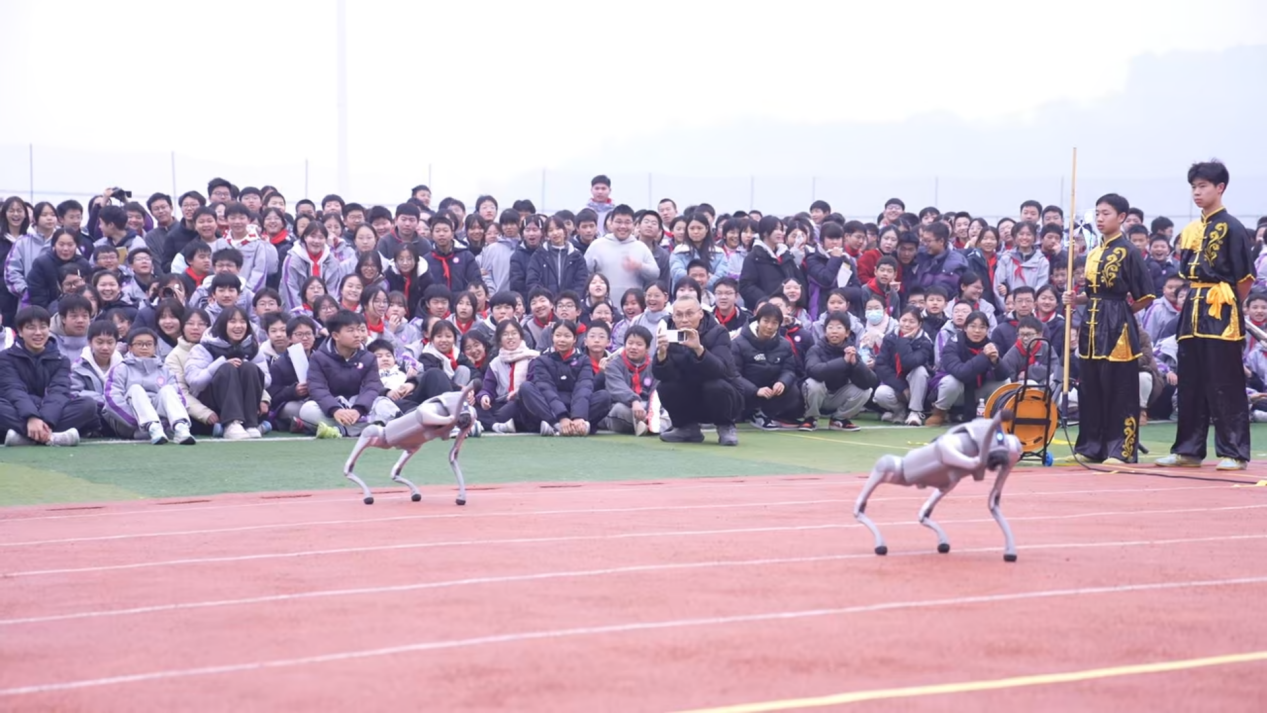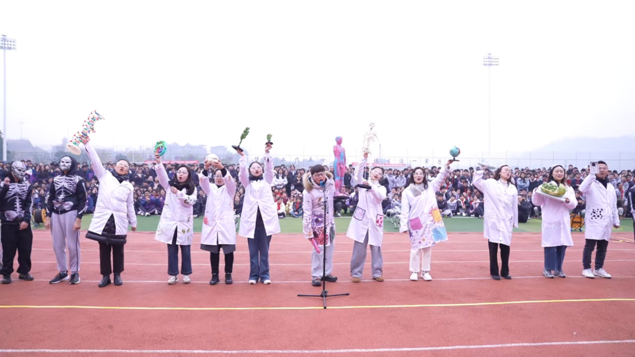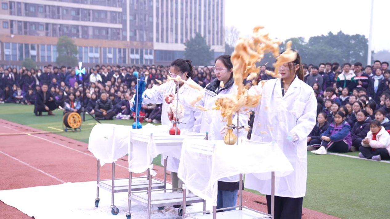 随后,教研室科技秀惊艳登场,将现场氛围推向高潮。生物组师生带来的《进化·演绎》,用生动的表演跨越时空,展现生命进化的奇妙历程;武术队与创客空间学子携手演绎的跨界秀,让传统武艺与智能机器狗同频共振,裸眼3D技术加持下,一场科技侠客梦徐徐展开;物理组的水火箭发射环节尤为震撼,同学们亲手制作的塑料瓶火箭在压力作用下喷射而出,水柱飞溅间,将牛顿定律的原理直观呈现;化学组的“冰与火之歌”让人目不暇接,火焰在掌心升腾后又悄然熄灭,彩色泡沫喷涌而出,每一个化学反应都引发阵阵欢呼,让大家真切感受化学世界的神奇魅力。