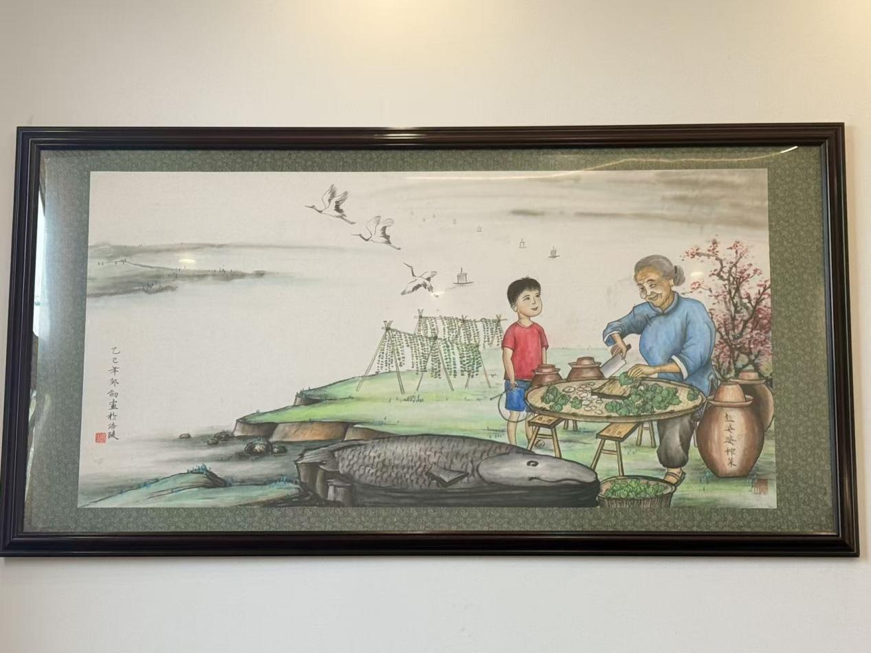 展现彭荣贵与婆婆制作榨菜场景的绘画作品。