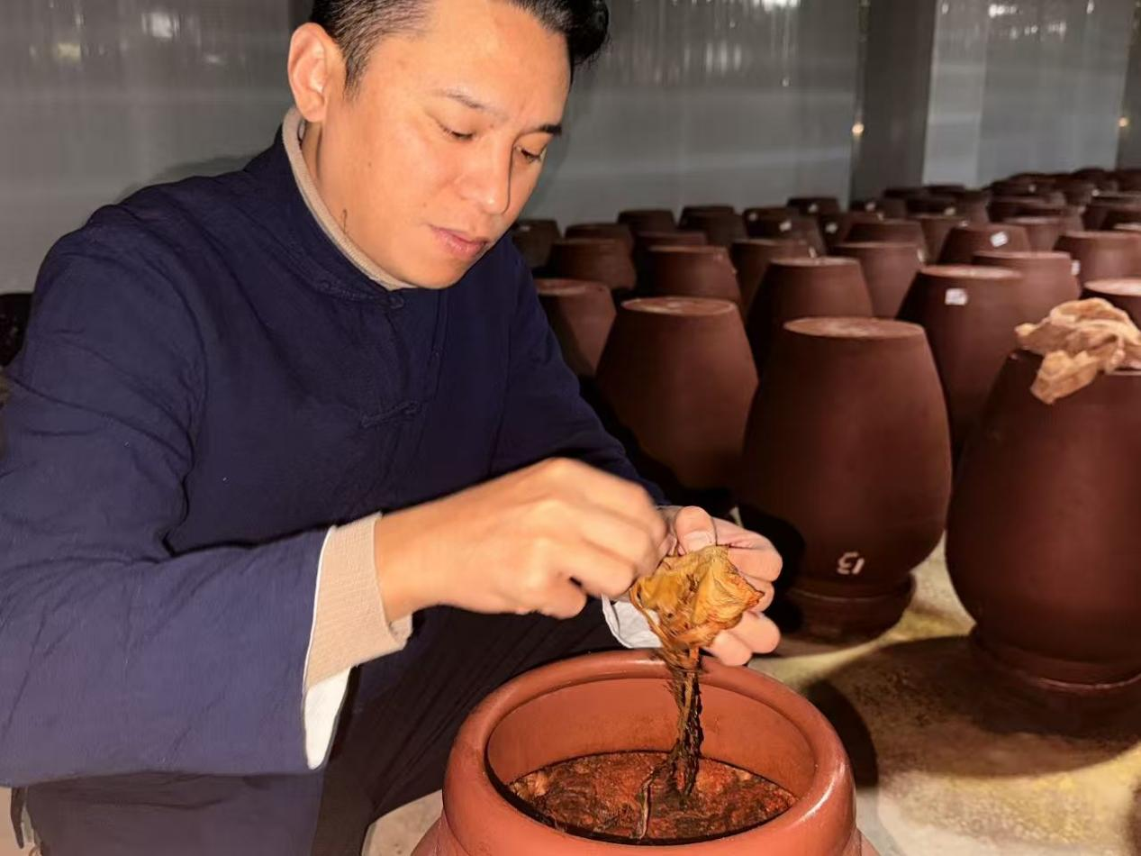 正是这从小浸润的技艺与情感,成了彭荣贵日后人生轨迹的锚点,更串联起祖、父、孙三代与榨菜割舍不断的羁绊。在外闯荡多年,故乡的榨菜香始终是他心底最深的召唤——这香气里,既有手艺的传承,也藏着家族守护老味道的初心。2013年,他决心从大海回到菜地,接过岁月沉淀的榨菜坛,让这份技艺继续生根。在此之前,彭荣贵是破浪的舵手,父辈坚守着寸亩菜地,婆婆把“三腌三榨”的门道手把手教给了他。既然选择返乡,他便将开船时“舟行千里定于锚,浪掀万丈稳于心”的精神注入传承,让古老技艺在新时代焕发新生。“我就想,这么好的东西,不能只留在我们这一代人的记忆里。把它做起来,让乡亲们在‘家门口’就能增收,让外面的人都能尝到地道的涪陵味——这是我从小的梦想,也是我们传承人接续守护的责任。”彭荣贵终将这份守护的手艺从小作坊做起,让榨菜香在家族的传承里飘得更远。