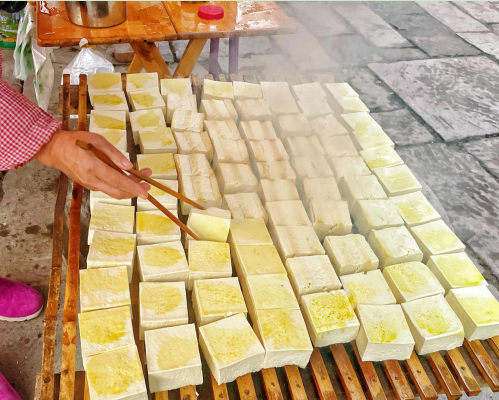 她也曾因常年烟熏火燎、工序繁复而疲惫,但她非常自信、自豪地说道:“我们每天做的烟熏豆腐都被卖空。”刚出锅的豆腐,总能闻到一股暖乎乎的烟火香,不是呛人的焦味,而是谷壳与炭火慢慢熏出来的醇香的香气,裹着豆腐本身的清甜。中间夹着的咸菜、折耳根与辣椒等调料还让它有了川味,咽下后舌尖又留着回甘,让人吃完一块,还想再来一块。
