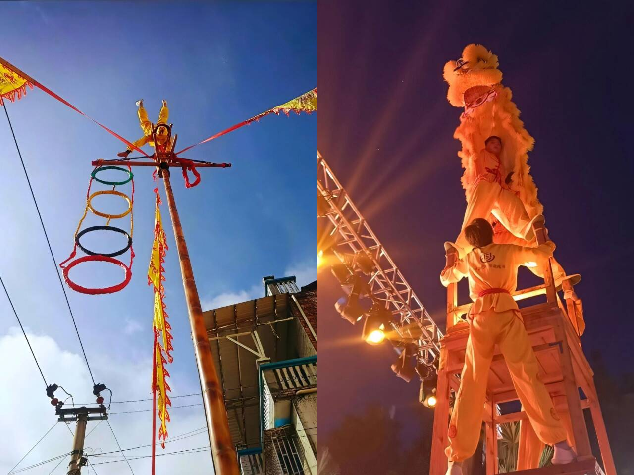 白沙杂耍——猴子爬杆(左)和翻五台(右)。