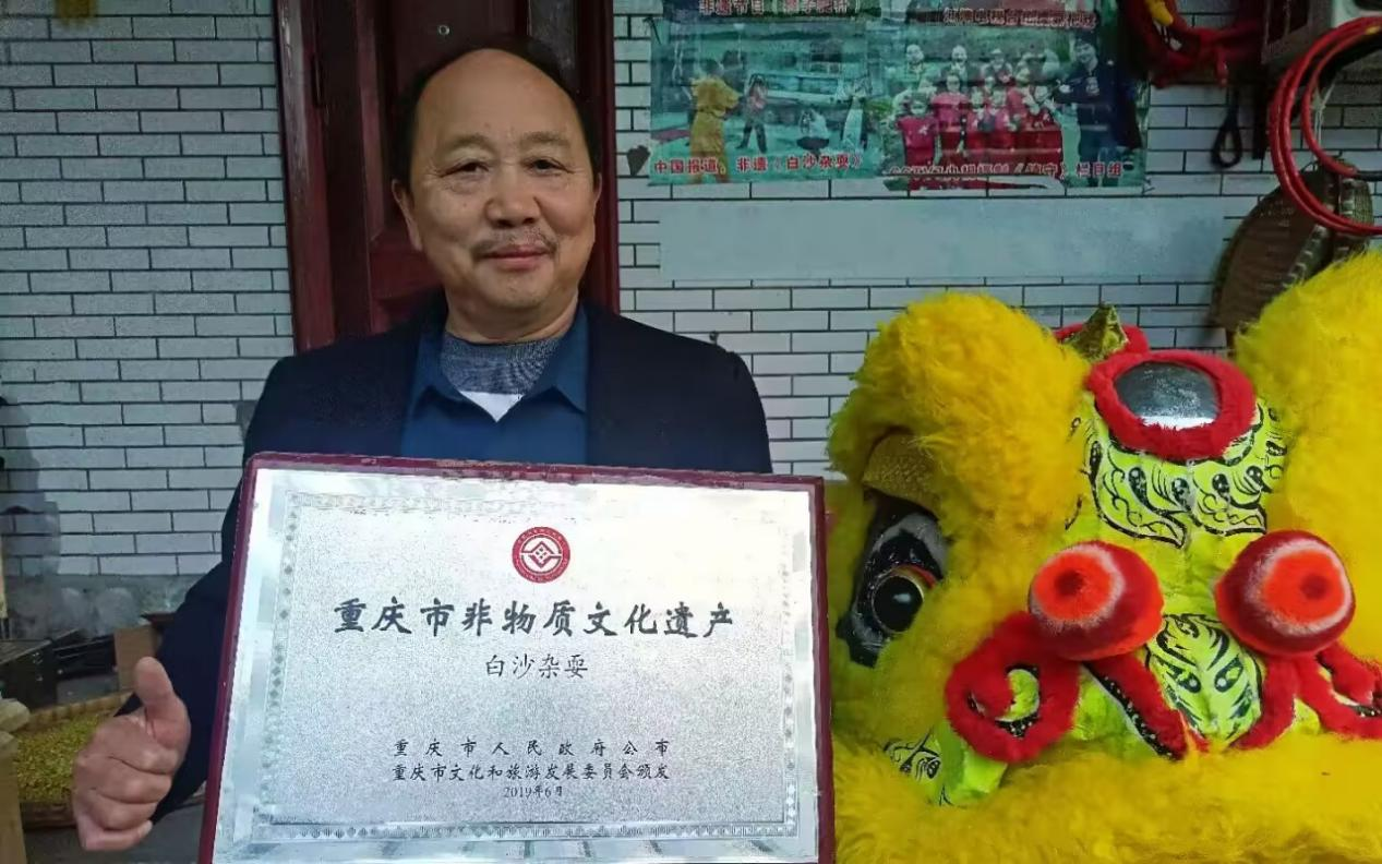 李龙祥的“守”,不止于“硬功夫”的锤炼,更在于对白沙杂耍的全力守护。多年来,他带着泛黄的族谱与老照片,奔走于各级部门,一遍遍陈述这门技艺的历史与价值。最终,从2019年入选重庆市第六批市级非物质文化遗产代表性项目名录,到2023年其道具制作技艺被列入区级保护名录,如同为白沙杂耍这棵飘摇的古树筑起了坚固的围栏。李龙祥用最笨拙也最坚实的功夫,将自己化为滋养古树的厚土,为千年杂耍技艺植入了最深的根。