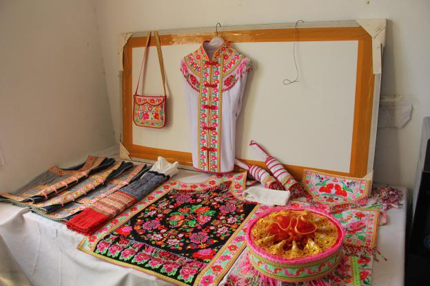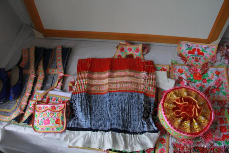 图为綦江苗绣代表性传承人熊兴树绣制的苗族嫁衣和头饰等。