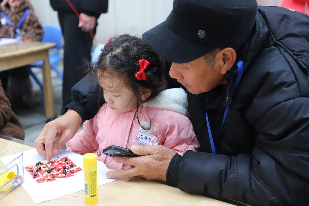 “五谷丰登‘福’”粘贴画活动将文化浸润与生活化教育完美融合,成为园所文化传承的鲜活实践。老师们以“福字的寓意”“五谷的由来”为切入点开展简短启蒙,让孩子们在创作前先感知中华优秀传统文化的独特魅力。孩子们用稚嫩的小手抓取、搭配、粘贴五谷,不仅精准锻炼了手部精细动作与手眼协调能力,更在与家长的协作中体会“亲子同心”的温暖与力量。