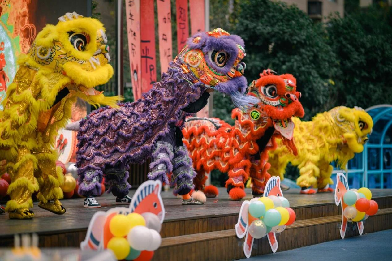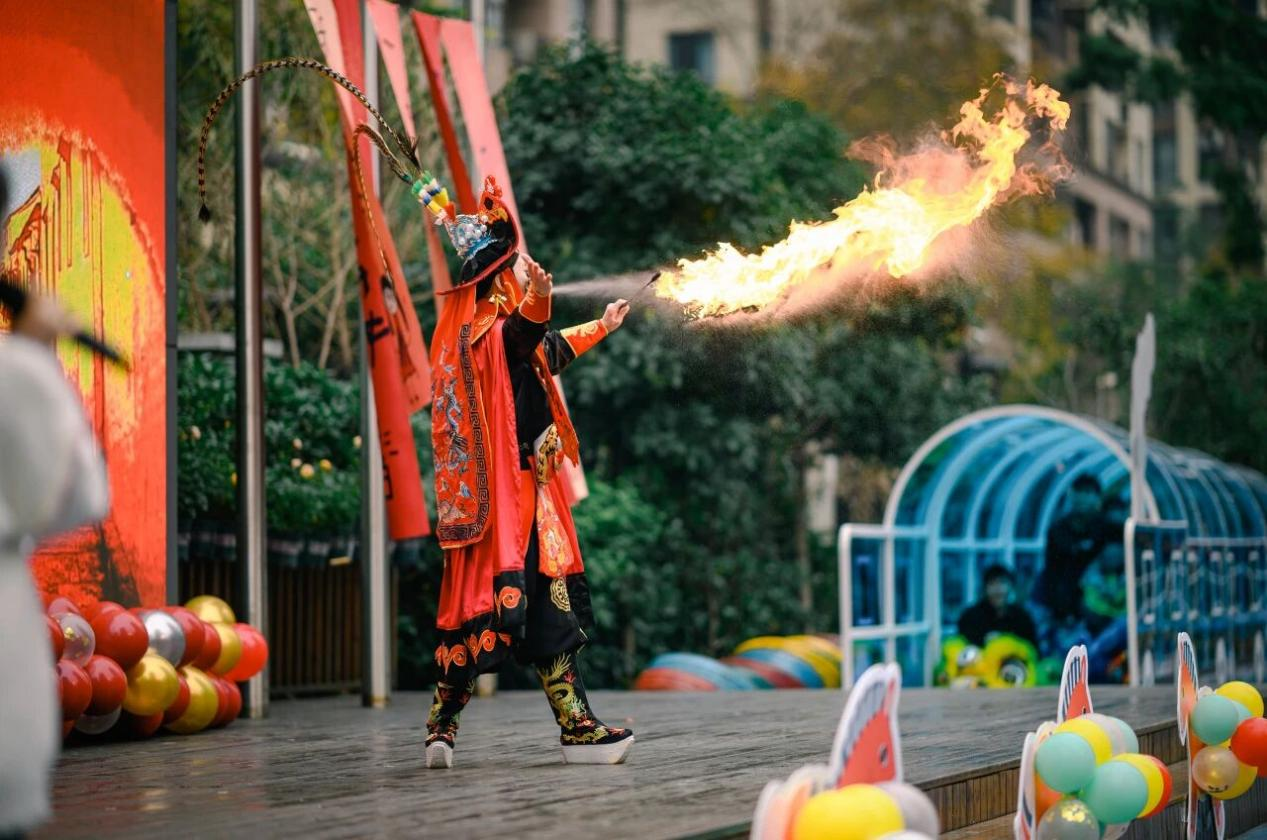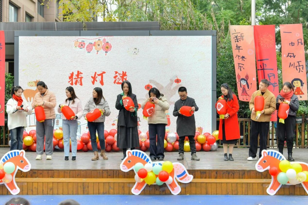 “非遗剧场”篇章拉开活动序幕。大班幼儿演绎的古风舞蹈《元日》惊艳亮相,灯笼上的剪纸装饰随舞步流转,诗韵与年味在舞台上交融。川剧变脸、亲子灯谜擂台赛、舞狮表演等轮番上演,让温暖与欢乐在歌声中传递。