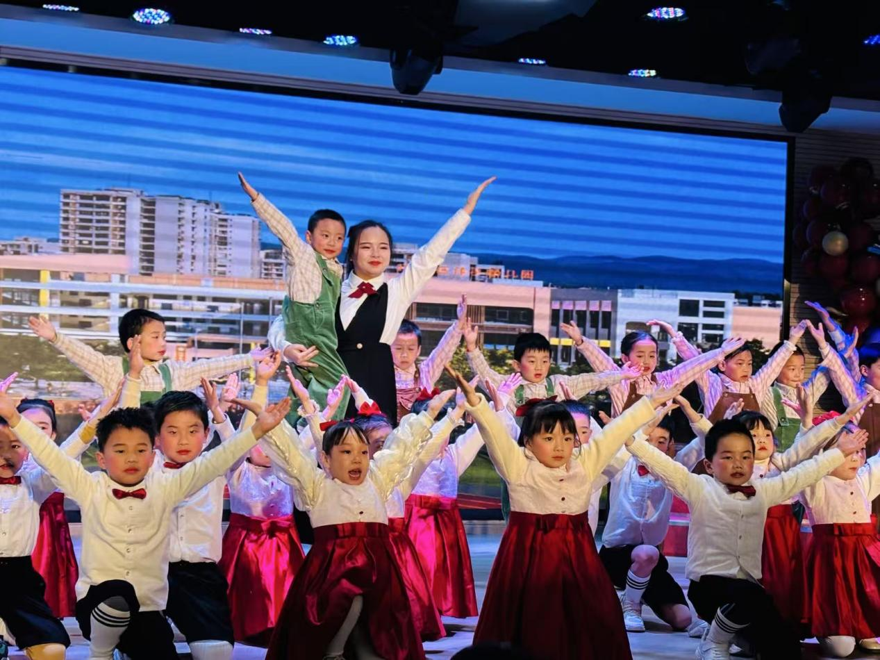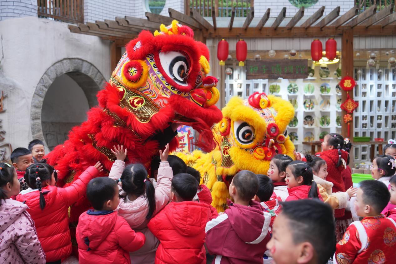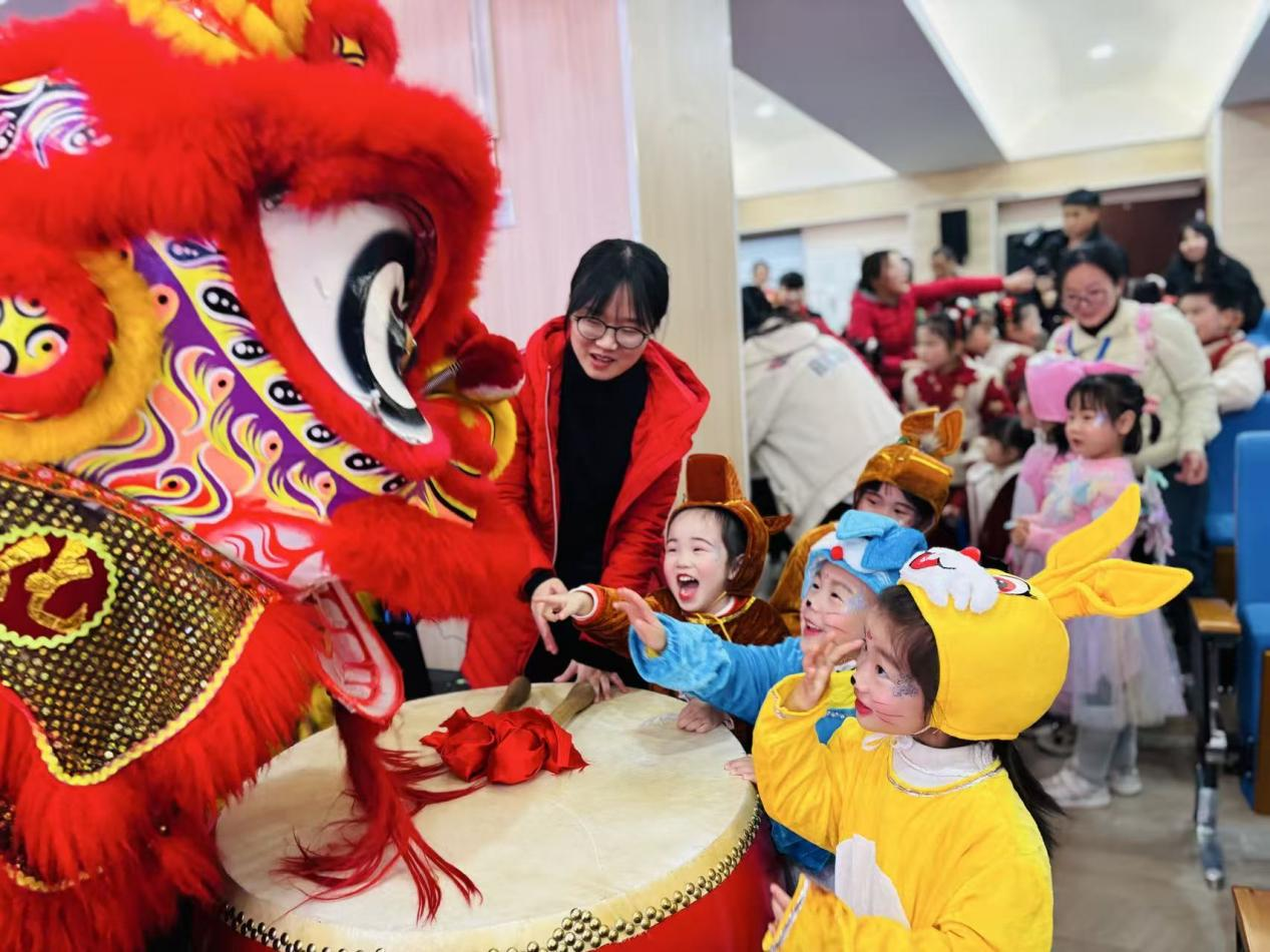 文艺汇演精彩纷呈,囊括歌舞表演、非遗展演、经典童话剧及AI动画秀、财神送福等环节,为孩子们送上了专属新年惊喜。中班幼儿表演的儿童情景剧《小马过河》通过小马尝试过河、听取不同建议并最终亲自实践的故事,生动传递“独立思考、勇敢尝试”的成长道理;师生互动节目《了不起的作孚爷爷》以问答形式展开,孩子们积极响应老师关于卢作孚先生与北碚家乡发展的问题,在对话中感悟乡土文化与先贤精神;《龙腾狮跃》节目中,家长们挥动长龙,孩子们灵动舞狮,与专业团队共同演绎了一场气势磅礴的精彩演出……此外,《暖暖时光》《小马贺岁》《爆竹声中一岁除》《福马闹新春》等歌舞表演也童趣盎然,现场掌声与欢笑声不绝于耳。