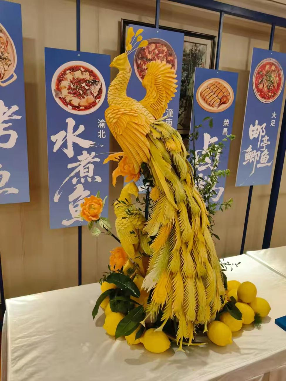 晚宴开始前,刘忠为大家带来了一场精彩的厨艺表演。他以新鲜食材为画布,以锋利的刻刀为画笔,手法娴熟地雕琢起食雕作品“孔雀开屏”。这道兼具美感与寓意的食雕,不仅展现了中式烹饪的独特美学,更暗藏“生活花开富贵,前程繁花似锦”的美好祝愿。作品完成后,库里忍不住俯身近距离观赏,连连发出赞叹。