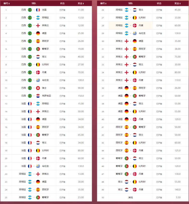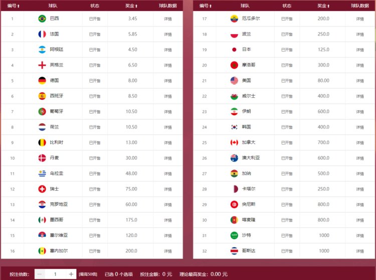 “冠军/冠亚军”玩法简介:“冠军”玩法即竞猜世界杯的冠军队伍,根据球队数量,共设置了32个投注选项;“冠亚军”玩法即不分顺序竞猜世界杯冠军和亚军球队,也就是哪两支队伍最终进入决赛,共设置了50个投注选项。