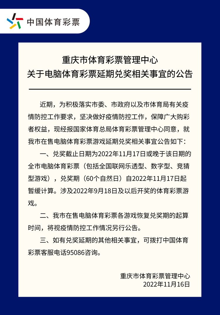 近期,我市疫情防控形势严峻复杂。为积极落实市委、市政府以及市体育局有关疫情防控工作要求,坚决做好疫情防控工作,保障广大购彩者权益,重庆市体育彩票管理中心经报国家体育总局体育彩票管理中心同意,决定就我市在售电脑体育彩票游戏进行延期兑奖,并于11月16日发布公告。公告提及:兑奖截止日期为2022年11月17日或晚于该日期的全市电脑体育彩票(包括全国联网乐透型、数字型、竞猜型游戏),兑奖期(60个自然日)自2022年11月17日起暂缓计算;我市在售电脑体育彩票各游戏恢复兑奖期的起算时间,将视疫情防控工作情况另行公告。
