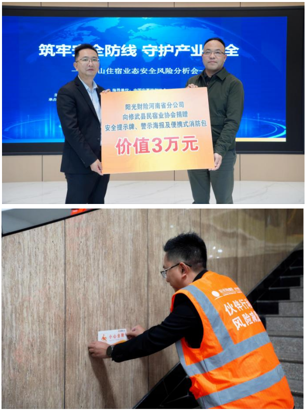 为推动安全措施落到实处,阳光财险现场向修武县民宿协会捐赠了数百套消防物资,包括应急包、安全标牌与警示海报等。会后,与会代表共同前往多家民宿,实地布置安全标识,与业主进行面对面交流。这种“查勘+评估+培训+物资+演练+实践”的闭环服务模式,为实现云台山景区住宿业态的风险减量奠定了坚实基础。