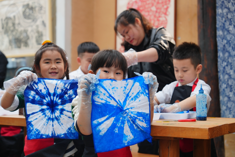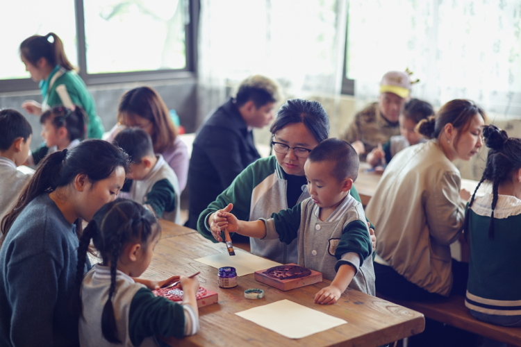 4月25日,重庆市綦江区古南街道花坝村,小朋友们在体验版画拓印。