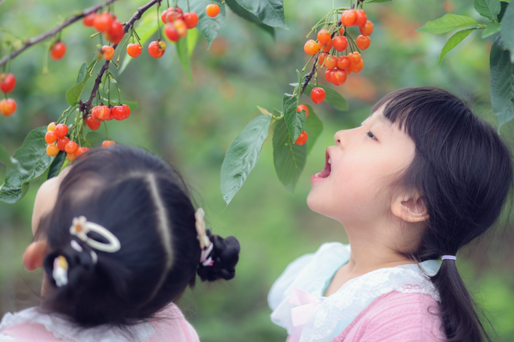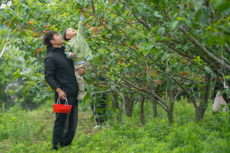 小朋友在樱桃园内感受采摘樱桃的乐趣。