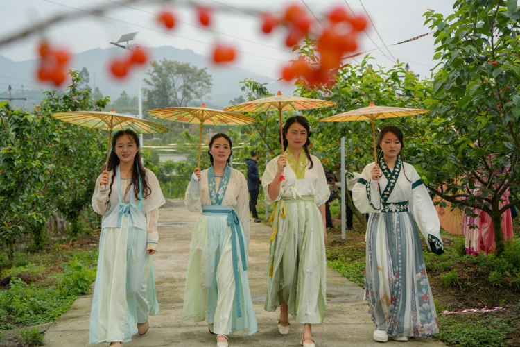 身着传统服饰的游客在花坝村樱桃园内游玩。