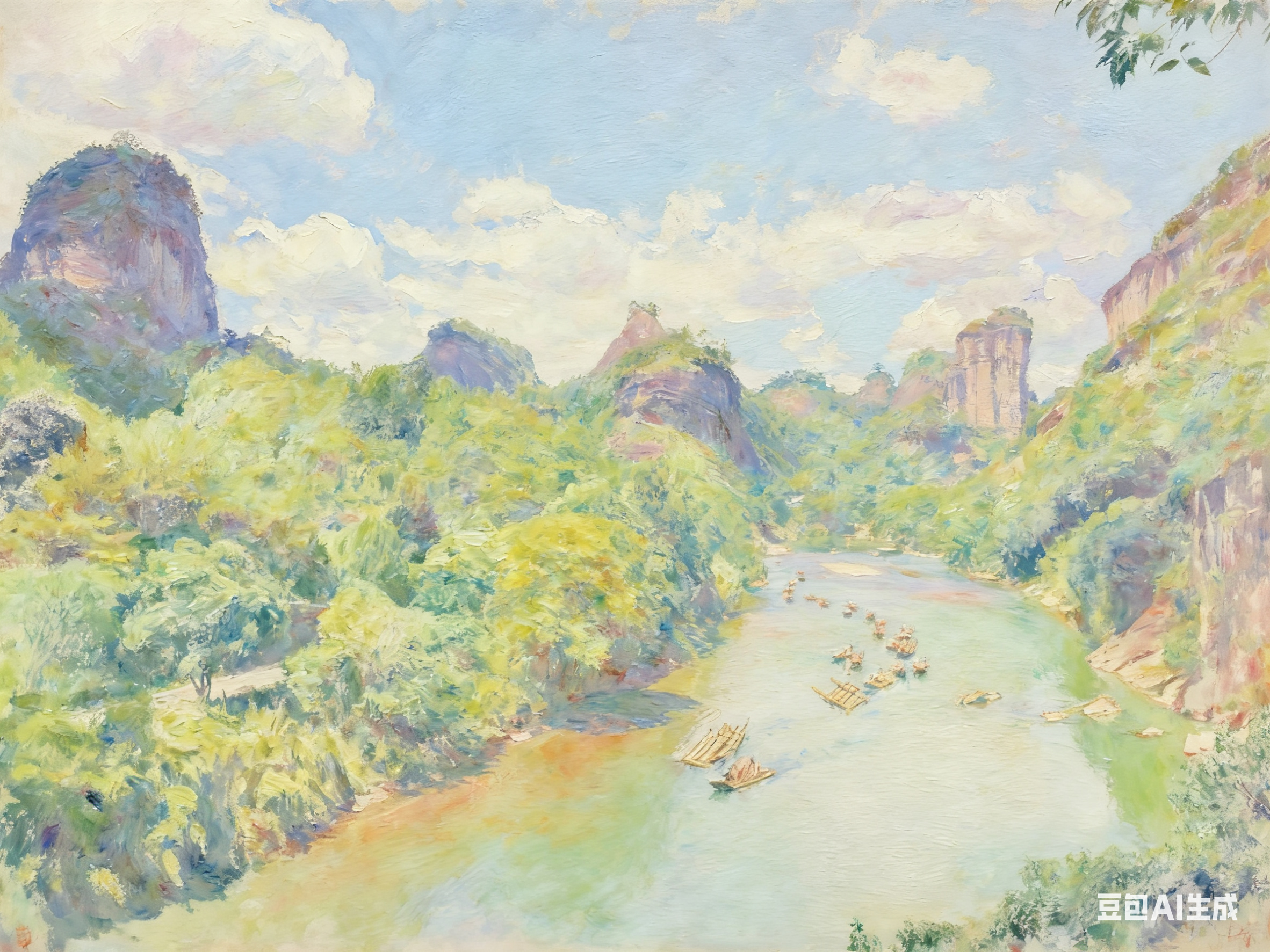 那天,我们进山坐竹筏漂流。竹篙划破浓绿色的水面,艄公的脚稳稳地卡入筏头一寸来深的凹槽,那经年累月的木痕,竟比他手中长竹竿上的包浆更加锃亮炫目。艄公撑篙的姿势十分特别——右手虎口抵住竹节凸起处,左手只虚虚拢着篙尾。篙尖轻轻点进溪水深处的刹那,脖颈上青筋暴起——四两拨千斤的手下功。