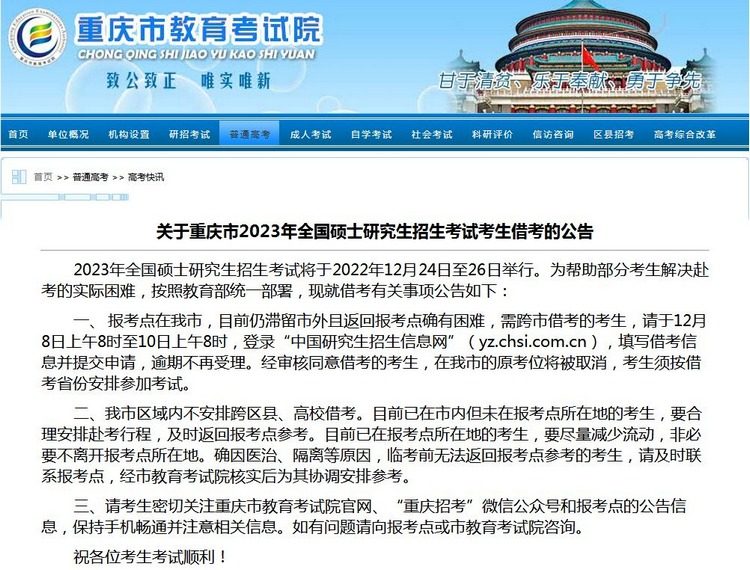 12月7日,重庆市教育考试院发布了《关于重庆市2023年全国硕士研究生招生考试考生借考的公告》。2023年全国硕士研究生招生考试将于2022年12月24日至26日举行,为帮助部分考生解决赴考的实际困难,按照教育部统一部署,请考生注意这些借考有关事项。