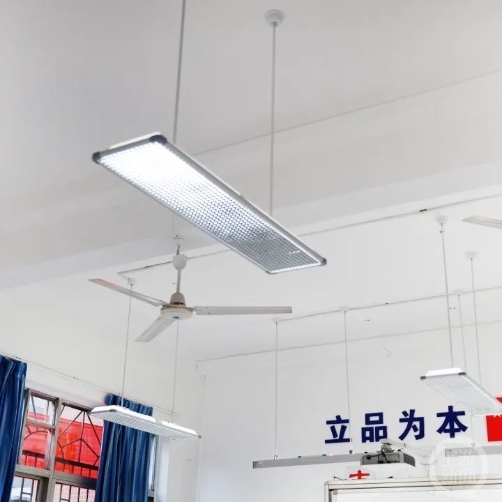 改造所选用的灯具,全面对照《儿童青少年学习用灯具近视防控卫生要求认证》和《中小学采光和照明卫生标准》要求,所有技术参数等指标均不低于认证标准,灯具通过透镜、扩散板和格栅的三重防眩光技术,使得光线更均匀、柔和,彻底解决了频闪、蓝光问题,在节能效能、采光效果等方面全面优化,为学生提供了更加安全、舒适的用眼环境。