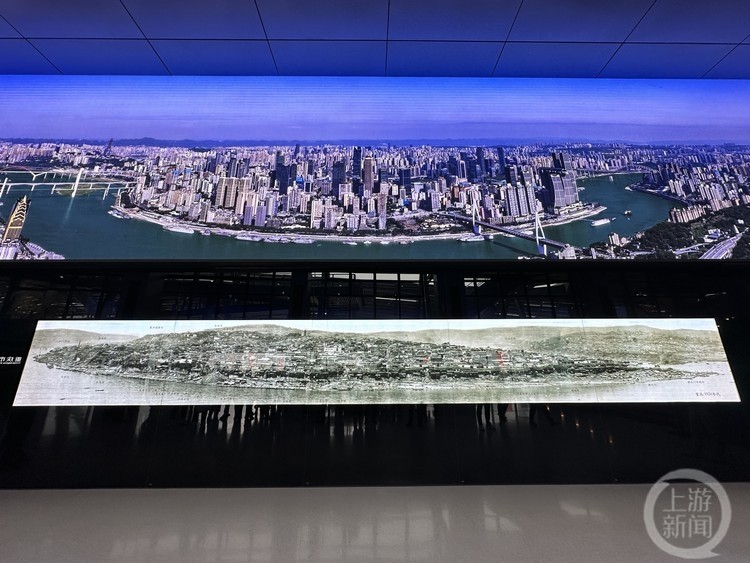 现场工作人员展示了两张相同角度拍摄的重庆渝中半岛照片,一张是在100年前,另外一张则是现在的重庆。