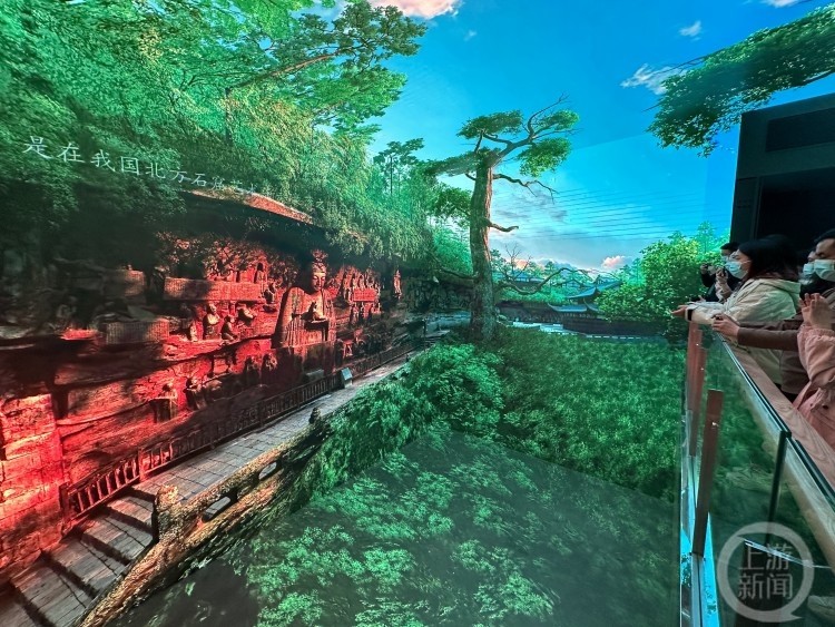 另外,展厅里还有大足石刻、白鹤梁题刻、钓鱼城的展示和介绍。反映重庆地理的城市眺望主模型也吸引了不少目光,该模型采用全域影像、搭载5G远程传输、配置8K超高清影像,打造出了别具一格的“城市秀场”,把2.87万平方公里主城都市区在1:7000的沙盘上尽收眼底。