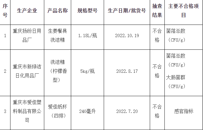近期,重庆市市场监督管理局组织抽查涉及食品相关产品中的食品用塑料包装容器等制品、食品用纸包装容器等制品、食品用餐具洗涤剂3个产品单元。共对在产企业生产的290批次产品开展了监督抽查,已检测中发现3批次产品不合格。