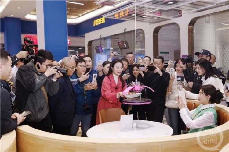 在机器人餐厅,人们还能品尝到由自动烹饪机、送菜机器人制作、端上的菜肴。