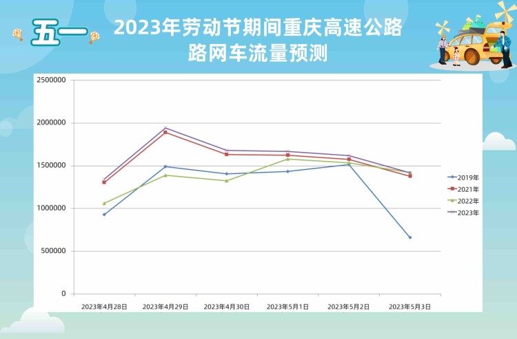 综合分析,预计2023年劳动节假期全路网车流量约892.8万辆次,日均约178.6万辆次,较去年同期上涨23.2%,较2021年同期上涨2.8%,较平日增长约94.8%;4月29日单日车流最高,约194万辆次。